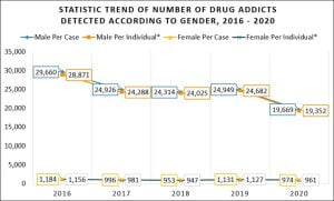 Statistic Trend Of Number Of Drug Addicts Detected According To Gender, 2016 – 2020