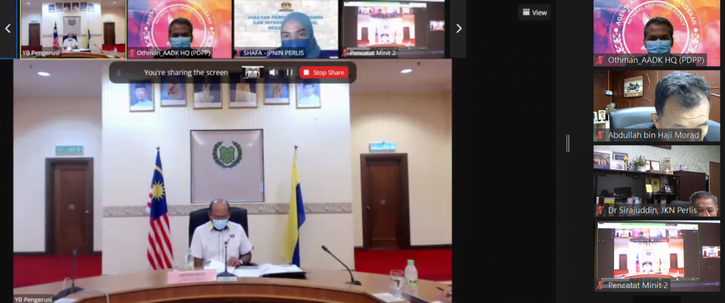 Perlis, August 17, 2021 – Mesyuarat Majlis Tindakan Membanteras Dadah (MTMD) Bilangan 1 Tahun 2021 Peringkat Negeri Perlis was held in Bilik Gerakan 1 Kompleks Dewan Undangan Negeri (DUN) Perlis, here, through video conference and face-to-face (hibrid).