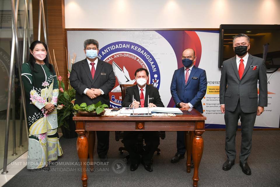 Datuk Jonathan (duduk) menandatangani buku lawatan ketika mengadakan sesi lawatan kerja ke Ibu Pejabat AADK di Kajang, Selangor pada 1 November 2021. – Gambar AADK / Muhammad Rashdan Mohd Zakaria