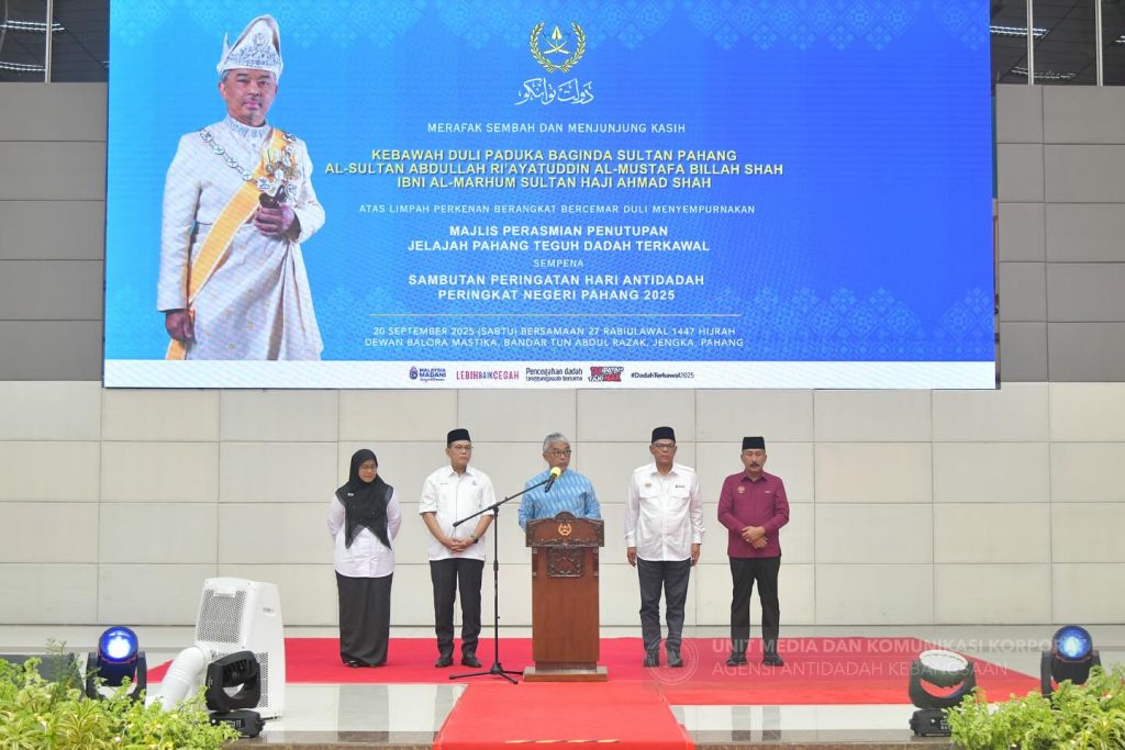 Jengka, 20 September 2025 – Majlis Perasmian Penutup Jelajah Pahang Teguh Dadah Terkawal (PTDT) 2025 sempena Sambutan Peringatan Hari Antidadah telah berlangsung di Dewan Balora Mastika, Bandar Tun Abdul Razak.
