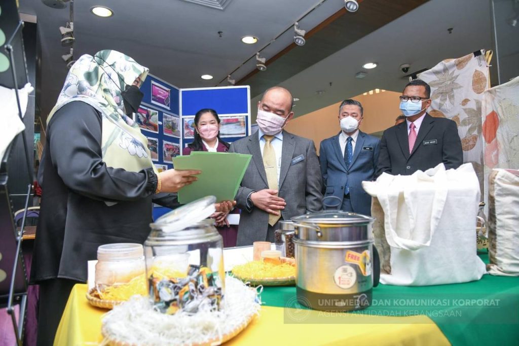 Tuan Sutekno (dua dari kiri) mendengar penerangan mengenai penghasilan produk daripada peserta pertandingan Hari Inovasi dan Kecemerlangan AADK 2021 di Ibu Pejabat AADK di Kajang, Selangor pada 2 November 2021. Gambar AADK / Muhammad Rashdan Mohd Zakaria