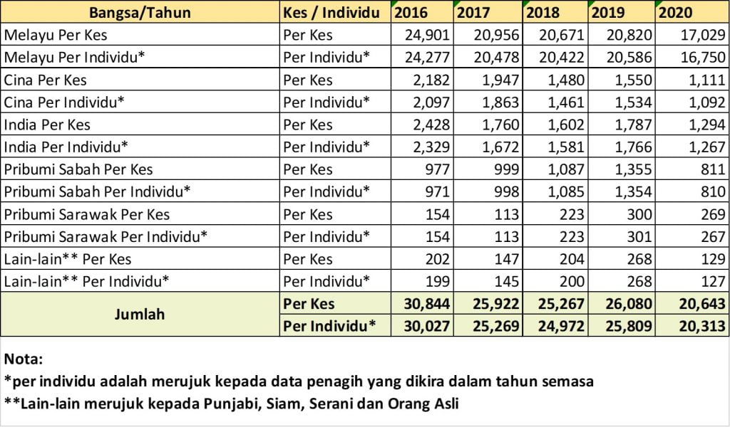 Trend Statistik Penagih Dadah Dikesan AADK Mengikut Bangsa, 2016 – 2020