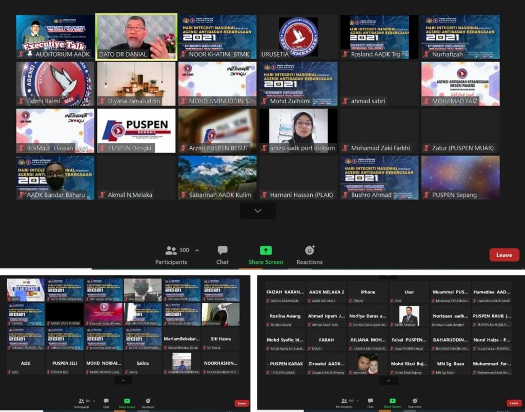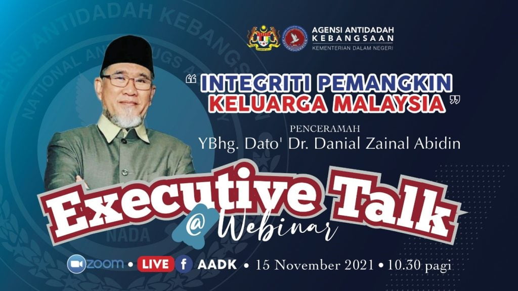 15 NOVEMBER 2021 – Webinar Executive Talk adalah antara usaha yang dilaksanakan oleh Unit Integriti AADK dalam mendidik warga AADK membina maruah dan menjauhi rasuah di dalam organisasi dan komuniti. Hanya melalui pendidikan dan perkongsian pengetahuan, nilai integriti dapat tumbuh dan berkembang di dalam sanubari. Perkongsian maklumat dan nilai yang amat berharga ini dijalankan secara teleconference (aplikasi zoom) dan FB Live AADK pada 15 November 2021. Penceramah berpengalaman YBhg Dato’ Dr Danial bin Zainal Abidin telah dijemput bagi menghuraikan tema “Integriti Pemangkin Keluarga Malaysia” dalam kontek AADK. Penerangan integriti dari spektrum ekonomi negara, perbandingan rasuah 3 negara (Brazil, Singapura dan Malaysia) telah memberi celik akal tentang kepentingan integriti dalam membina negara bangsa yang disegani oleh dunia. Seramai lebih 500 peserta telah hadir secara bersemuka dan online ke program webinar kali ini.